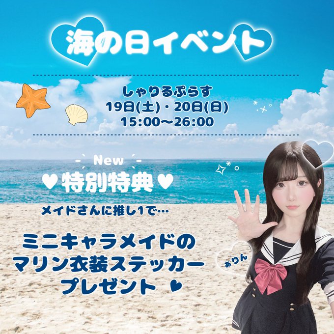ゆめ🎀しゃりるグループさんがリポスト宇都宮で生演奏を聴きながら楽しめるメイドカフェバー🏰Charilu+〜しゃりるぷらす〜@Chariluplus·♡イベントのお知らせ♡ 19日・20日はしゃりるぷらすにて海の日イベントがございます 海を感じる衣装のメイドさんがおります♡是非ご来館下さい🏝26522