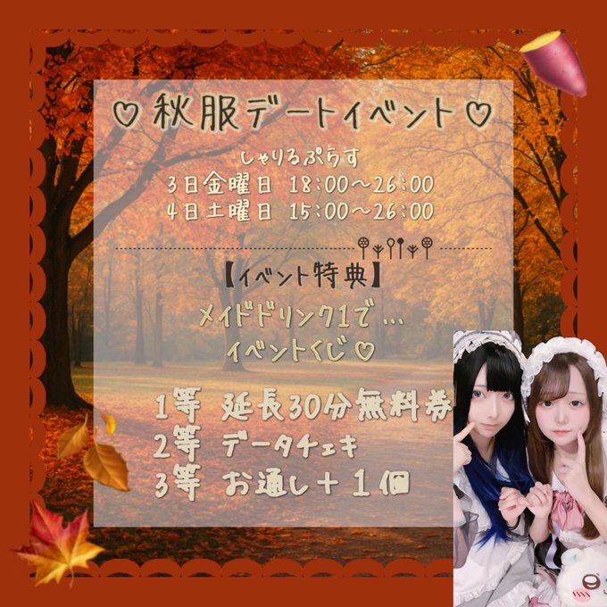 ナツ❄️しゃりるグループさんがリポスト宇都宮で生演奏を聴きながら楽しめるメイドカフェバー🏰Charilu+〜しゃりるぷらす〜@Chariluplus·🍁イベント告知🍁 10月の第1週目は秋服デートイベントです♡ いつもとは違うメイドさんに会いに来て下さいね✨ ⚠️特典1等は10月5日から使用できます24174