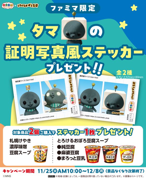 栃木・宇都宮 マジカルドールソフィてゃ🍼🤍@sophie_babuchan·6時間ファミマ!!!!!引用正方形のプロフィール画像日清カップスープ公式 とうふ係のくま@nissin_soup·11月24日✧˚₊⋆⸜ ファミリーマート限定⸝⋆₊˚✧ 25日(火)から、ファミリーマート限定で対象商品2個ご購入でステッカーをプレゼント! タマくんがぼくとおそろいの豆腐のかぶりものをかぶってくれています!みんな店頭でみつけてね! #とろけるおぼろ豆腐 #とうふ係のくま #とうふ係のタマ5106