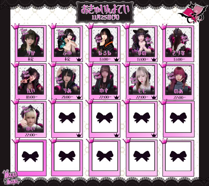 川崎・横浜・関内 MyuMyu🩷MyuMyu川崎🖤@MyuMyu_kawasaki·🖤MyuMyu通信🩷 11月もイベント毎日開催🎶 🎰 ガチャ割引 💖 初めまして割 【👑本日の出勤情報👑】 🖤ねるね 17- 🩷ふゆ 17- 🖤なの17- 🩷みこ18- 🖤あむ20- 🩷なな20.5- 🖤りあ21- 🩷ゆず22- 🖤りか22- 🩷のあ22- ➡️ 各SNSはこちらからチェック💌 🔗 https://lit.link/myumyu-kawasaki35