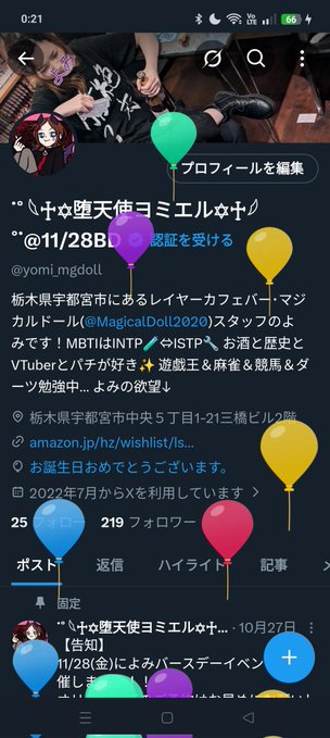 栃木・宇都宮 マジカルドール˙˚ 𓆩♱✡堕天使ヨミエル✡♱𓆪 ˚˙@11/28BD@yomi_mgdoll·風船飛びました🥳719210