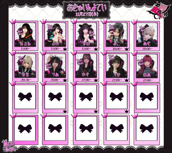 川崎・横浜・関内 MyuMyu🩷MyuMyu川崎🖤@MyuMyu_kawasaki·🖤MyuMyu通信🩷 11月もイベント毎日開催🎶 🎰 ガチャ割引 💖 初めまして割 【👑本日の出勤情報👑】 🖤あむ 同伴 🩷みこ17- 🖤しの18- 🩷さりな17- 🖤あいら17- 🩷ねぎま20- 🖤にゃず20- 🩷ひな22- 🖤ゆず22- 🩷もも22- 🖤りか22- 🩷のあ22- ➡️ 各SNSはこちらからチェック💌 🔗さらに表示10