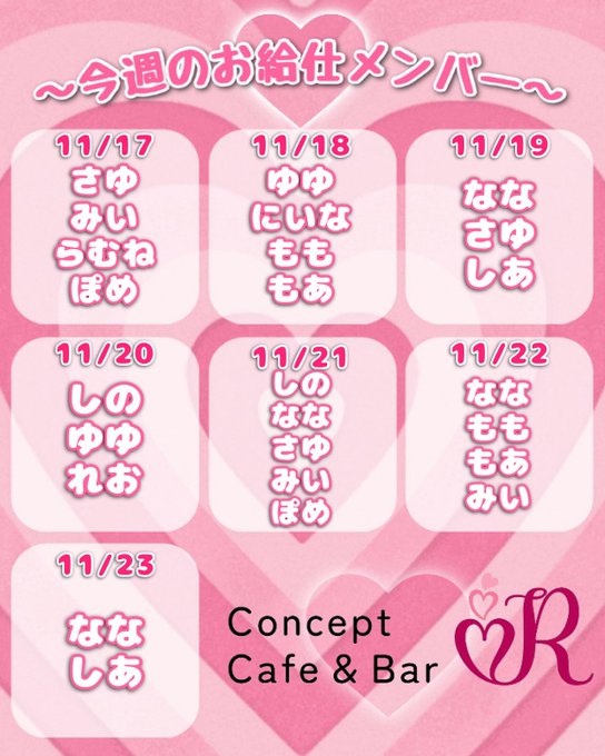 群馬・高崎 Concept Cafe&Bar R固定前橋コンセプトカフェ&バーR@ccb_r_maebashi·🫶🏻今週の出勤情報🫶🏻 いつもご帰宅ありがとうございます!!! 今週のお給仕メンバーをお知らせいたします📢 みなさまのご帰宅をお待ちしてます♡ ※出勤メンバーは変更になる場合がございます。 #コンカフェ #群馬 #前橋188