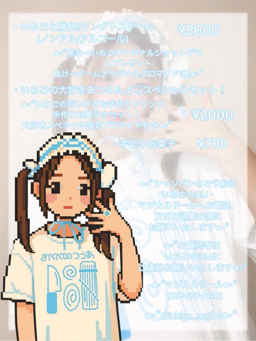 🍓@ichigo_mgdoll·5時間リングトスゲームの勝ち景品はこちらになります♡ 情報通のわたしが聞いた噂によるとこのグラスでのんだら15倍美味しく感じるとか。なんかそういう幻のショットグラスです。 コリァゲットするしかないでしょ!!!💘引用🍓@ichigo_mgdoll·9月16日🍥告知!!🍥 10月17日にいちご2回目のバースデーイベントをさせていただきます*.+゚ お誕生日だーいすきなのでだいすきなみんなと一緒に楽しくのめたらうれしいです🍹 ご予約、ご帰艦お待ちしております💘1376
