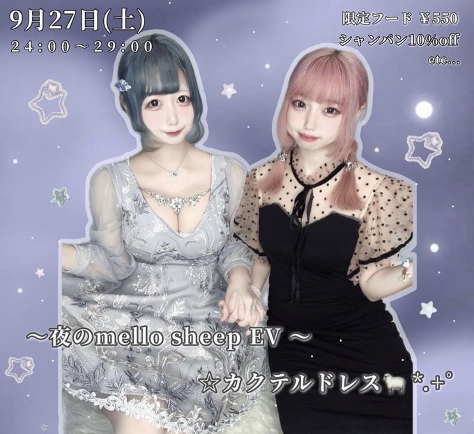 める 【 mello sheep 】さんがリポストmello sheep ໒꒱· ゚ᶻᶻ 【 コンカフェ 】@mello_sheep·今夜も深夜営業始まりました𖦹. ̫ .𖦹 本日24時からイベントとなってます!! 1時間2400円のご案内です︎︎☾*。 今夜のイベントはシャンパンやテキーラなどが10%offとお得になってるので是非羊さん達といかがでしょうか❔︎👍🏻 ̖́-616637