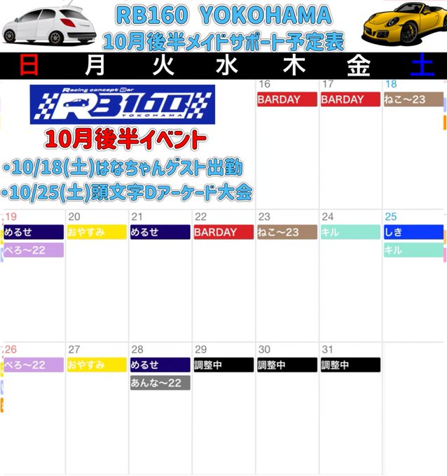 川崎・横浜・関内 クルマ系コンカフェ RB160 YOKOHAMA (横浜/関内)固定クルマ系コンセプトカフェ RB160 YOKOHAMA(横浜/関内)@クルマ乗りメイドさん大募集@rb160yokohama·10月後半のメイドサポート予定表です🎀 10月後半のイベントは ・10/18(土)はなちゃんゲスト出勤 ・10/25(土)頭文字Dアーケード大会 イベントご予約はこちら🫶 はなちゃんイベント🚗 https://docs.google.com/forms/d/e/1FAIpQLSdNhFtQ40j3pEZqfKZVTgIx1XtNLPwXhd4SDLJKT2yTiGqmsA/viewform… 頭文字D🚗 https://rb160yokohama.stores.jp/items/68bffa8bfb3f2d365be0b374… #RB160 #クルマ系コンカフェ #コンカフェ #横浜5145,685