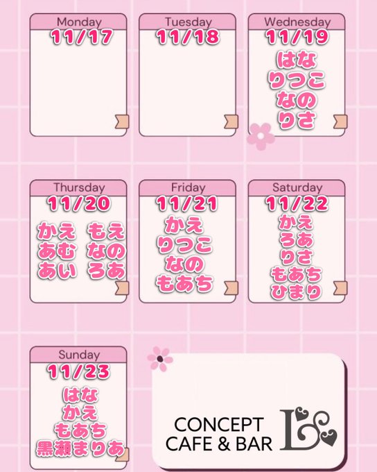 茨城・水戸 CONCEPT CAFE&BAR L固定水戸コンカフェ&バーL@ccb_l_mito·🫶🏻今週の出勤情報🫶🏻 いつもご帰宅ありがとうございます!!! 今週のお給仕メンバーをお知らせいたします📢 みなさまのご帰宅をお待ちしてます♡ ※出勤メンバーは変更になる場合がございます。 #コンカフェ #茨城 #水戸44