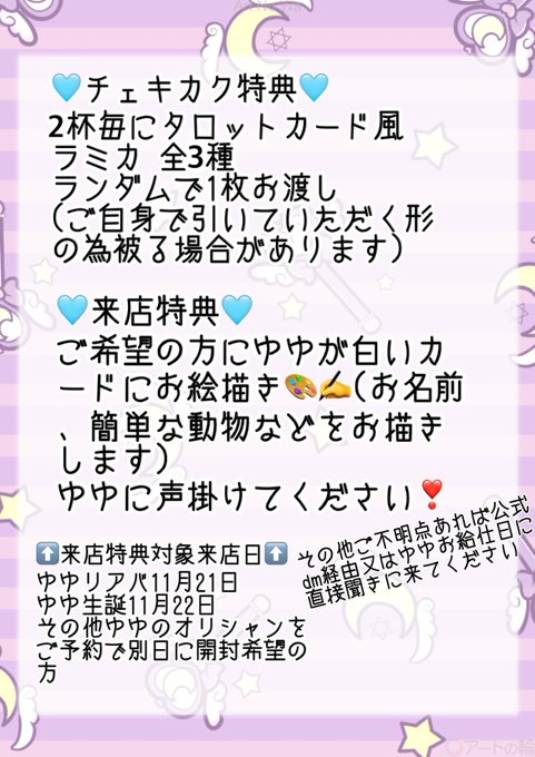 栃木・宇都宮 マジカルドールみかみさんがリポスト🫧みずき@コンカフェ屋さん!@mgdoll_mizuki·13時間デキャンタ&オリシャンのご予約は本日22日までになります! お忘れのないよう、ご予約よろしくお願いいたします☺️ その他シャンパンメニュー、観覧車は【前日までに】ご予約お願いいたします🙇♀️ コカボムタワーは、スタンドの準備があるため、【25日までに】ご予約お願いいたします! #コンカフェ引用🫧みずき@コンカフェ屋さん!@mgdoll_mizuki·11月21日〜オリシャン一部変更のお知らせ〜 オリシャンは、初期メイドみずきか春麗みずきの2種類からお選びいただけます!(ご予約の際にお伝えください) デキャンタとオリシャンの予約は、明日22日で締め切ります! DM、お電話、みずきに直接でもOKです☺️ お早めにご予約お願い致します😭✨ 画像はこちら⬇ x.com/mgdoll_mizuki/…420781