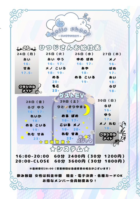 埼玉西エリア・川越・坂戸・東松山 mellow sheep曖昧もこ【 mello sheep 】さんがリポストmello sheep ໒꒱· ゚ᶻᶻ 【 コンカフェ 】@mello_sheep·🐑 お ー ぷ ん 🌃 +. 🌙 ・ 2 4 : 0 0 - 2 9 : 0 0 ・ ♡ 🎶 1 時 間 3 6 0 0円 飲 み 放 題 🌟 ♡ メノちゃんとらぴちゃんとあいちゃんの3人でお待ちしております⚡️🤍32569