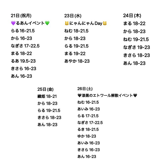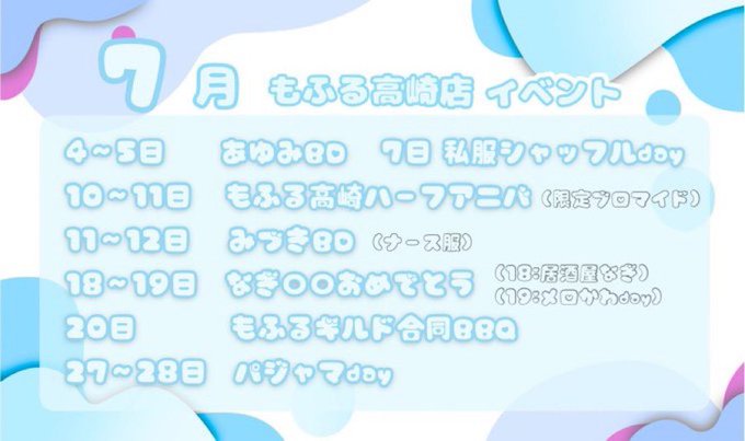 王立アフィリア・ブルジュール(大宮)@blujour_afilia·本日のブルジュールは18時から23時まで営業します 夏の私服エンカウントstart♡ シアン メア~2130 ポメ ルル~2130 7/21~24夏の私服EC 7/25ポメぷちBD 7/26CLUBネオン 7/28.29なにわの日 7/30.31ネオン監修激辛2DAY 8/9ミユウ2周年&BD 8/19~23浴衣24460
