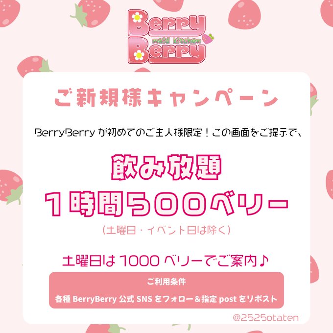 メイドキッチンBerry Berry🍓@2525otaten·本日もご帰宅ありがとうございました✨ 明日も19時よりお待ちしております🍓 7/17(木)お給仕担当メイド マキナ🔰 ちゃみ🔰 #群馬 #太田 #メイドカフェ #コンカフェ #関東 #メイド服 ✨BerryBerryお得なキャンペーン✨ ご新規様→初回500ベリー飲み放題💕 リピーター様→半額クーポンプレゼント🎁14415
