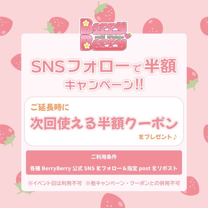 メイドキッチンBerry Berry🍓@2525otaten·BerryBerryおーぷん🍓🍓 ご主人様・お嬢様のご帰宅をお待ちしております♡ 7/17(水)お給仕担当メイド ミサミサ いなせ🔰 #群馬 #太田 #メイドカフェ #コンカフェ #関東 #メイド服 ✨BerryBerryお得なキャンペーン✨ ご新規様→初回500ベリー飲み放題💕 リピーター様→半額クーポンプレゼント🎁2344