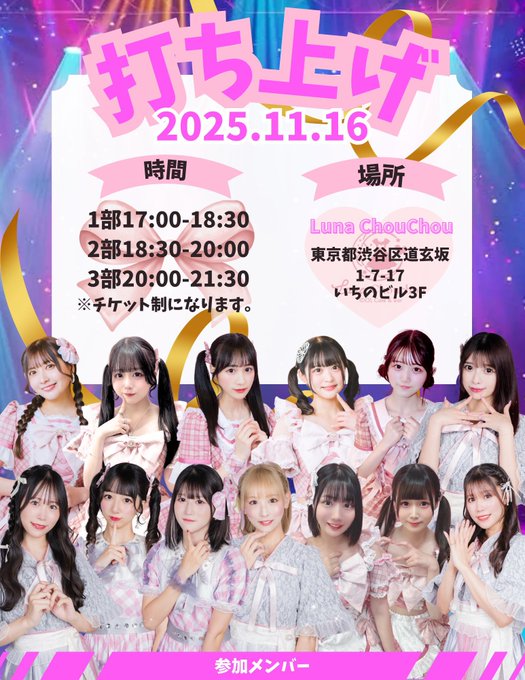 渋谷・中目黒・五反田 Luna Amour七瀬いづみ@icchan_nns·1時間打ち上げは予約制なのでまだな方早めにお願いします! もうすぐ空きなくなります💦引用七瀬いづみ@icchan_nns·2時間最終リハと決起集会でした! 明日は定期公演✨ 定期公演を続けられるのは当たり前じゃないということに感謝して、一つ一つ大切にライブしていきます✊🏻🩷 定期も対バンも、毎回成長を見せられたらいいな!1回1回が大切なライブばかりで大袈裟とかじゃなく本当に皆の力も必要なのでついてきてね!9311