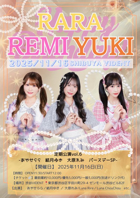 Luna Amour🩷11/16定期公演vol.6@LunaAmour_cafe·\ 明日よりチケット発売!🎀/ 11/16 定期公演vol.6 〜らら・ゆき・れみバースデーSP〜 明日26日(金)21:00より チケット販売開始🎫♡ 🎟️ https://t.livepocket.jp/e/rarayukiremi_1116… 🤝招待チケットは購入後 11/14 23:59までにこちらのフォームに お名前・枚数を記載お願い致します ୨୧⑅ https://docs.google.com/forms/d/e/1FAIpQLSfmD2CpV1mRdrdEh5m2iBVJXxfFeJSQEZiu-fkfrNhrtXM_Gg/viewform…17243,980
