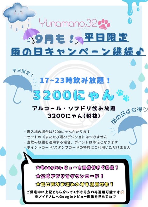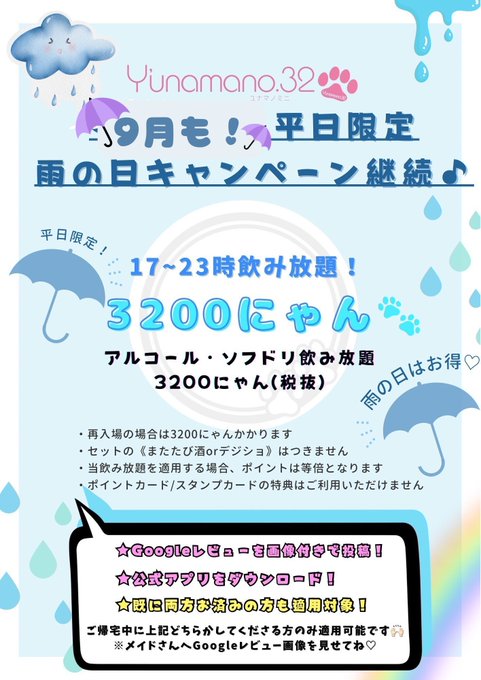 黎愛 れおん✝️さんがリポストアニソンメイドカフェYunamano32 (ユナマノミニ)三軒茶屋店@yunamanoanison·今日雨の日キャンペーンやってます☔️☔️☔️☔️☔️☔️12265