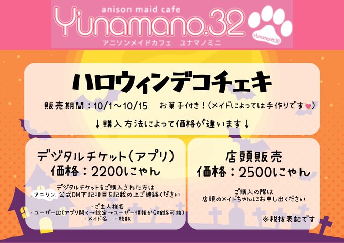 ゆらさんがリポストアニソンメイドカフェYunamano32 (ユナマノミニ)三軒茶屋店@yunamanoanison·🎃🦇ハロウィンデコチェキ予約開始🕸👻 購入方法は ・店頭販売 ・公式アプリ内のデジタルチケット購入 でお買い求め頂けますദി- ̫ -)♡ デコチェキにはお菓子も着いてきますよ🍭 ぜひお買い求めください🎶832,229
