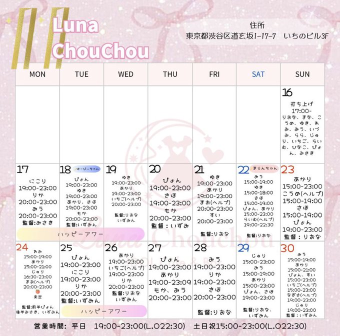 渋谷・中目黒・五反田 Luna Amour一ノ瀬すいさんがリポストLuna Chouchou(Luna Amour Group)@_lunachouchou_·11月19日🌙店舗対抗企画🎀 ショットorチェキおひとつご注文につき シール1枚お渡しできます! 白黒になってしまったロゴをより多く飾り付けできた店舗の勝利✨ 勝利した店舗は12月先行して3号店の『Luna Etoile』の衣装を着ることができます👗💎 店舗一丸となって飾り付けお願いします🤝🏻引用Luna Chouchou(Luna Amour Group)@_lunachouchou_·11月10日【✏️文化祭イベント🏫】 \期間🎀11/24(月)〜11/28(金)/ 🍴限定メニュー ・Rire♡手作りフード ・Chouchou♡手作りおばんざい 🥂シャンパン・観覧車特典🎡 デコスマホケース Luna Rire、Luna Chouchou 衣装交換をしてお待ちしています👗♡16147,582