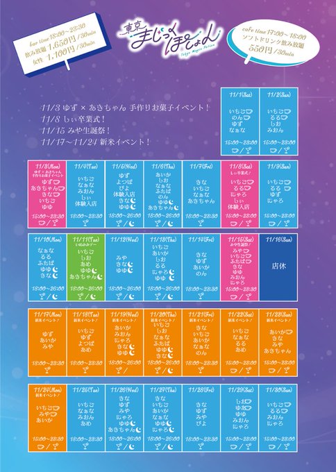 渋谷・中目黒・五反田 東京まじっくぽーしょん固定東京まじっくぽーしょん目黒店@toumaji_info·【11月のシフト&イベント】 11/3ゆず×あきちゃんお菓子イベント🍪 11/8 しぃ卒業式🌸 11/15 みや生誕祭🎂 11/17〜11/24新米イベント🌾 *☼*―――――*☼*――――― 11/7(金)上野店グランドオープン✨ ポイントカードは全店共通です!! *☼*―――――*☼*―――――896,306