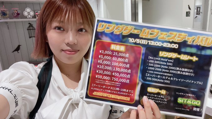 KKLIVE POKER SHIBUYA@KKLIVESHIBUYA·Oct.5.sun 本日も、KKSBオープンです! 渋谷エリア割有り❗️ 当日渋谷区でポーカーを遊んでいた証明をお見せ頂くと1000円割引! ▼13:00-リングフェス! 200-500-500 500-1000-1000 1000-2000-2000 スーパーホールデム クレイジーパイナップル🍍さらに表示1720