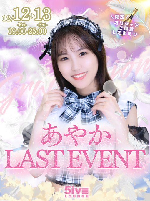 渋谷・中目黒・五反田 ファイブラウンジ 渋谷コンカフェ渋谷コンカフェ🎀5iVE(ファイブ)🎀ConCafeLounge 5iVE@5ive_Lounge_S·12/12🌟営業時間19:00〜25:00🌟 🌸あやか LAST EVENT🌸 🎀あやか 🎀れみ 🎀あむ 🎀るびぃ 🎀ひちゃ 🎀あず 🎀なな 🎀あん 🎀さつき 🎀るり ✨1set 40min 🍻飲み放題・20種類以上 🎤カラオケ無料 ガッツリ飲みたいときに嬉しい豊富なラインナップ🍾 渋谷の夜を盛上げます!!さらに表示174