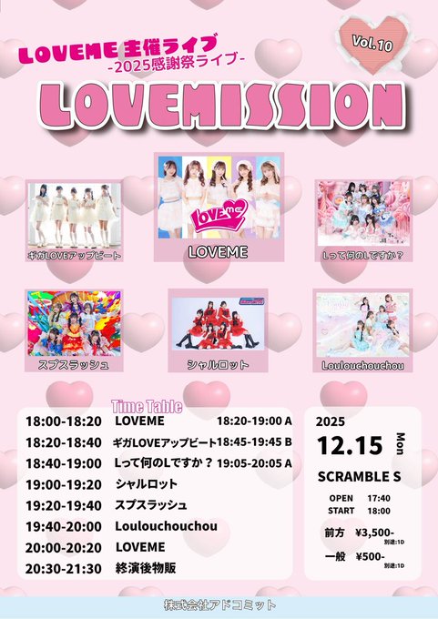 渋谷・中目黒・五反田 Luna Amour黒宮しいか☁️【LOVEME】@_shiikadayo·4時間今回のLOVEMISSIONも出番2回‼️なんと合わせて40分🎶ྀི 特典会も2回⁉️衣装違うの着ちゃうよ🥰 1回目は普段見られないあの歴代衣装🥰 2回目は念願のカラーチェンジ💖 誰が誰のカラー着るのかお楽しみに🥰💙 私のは誰かな〜🎶ྀི💙私も何色着るでしょう‼️ 来なきゃ損‼️な公演です‼️‼️‼️引用LOVEME@LOVEME_idol·11月12日💖情報解禁💖 12/15(月) 『LOVEMISSION Vol.10 -2025感謝祭ワンコインライブ-』 ▪︎会場:Shibuya SCRAMBLE S ▪︎チケット(別途1D) 前方チケット ¥3,500- 一般チケット ¥500- ▪︎指名特典(前方のみ):写メ券(メンバー選択可) ▪︎チケット11/13(木) 22:00~ https://t.livepocket.jp/e/a56ei2313653