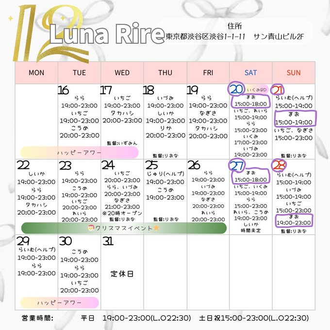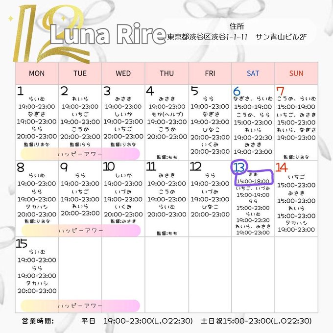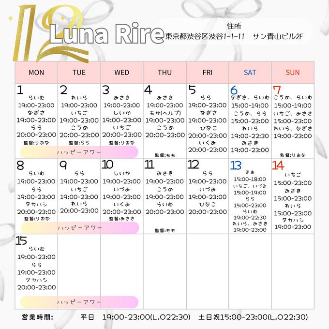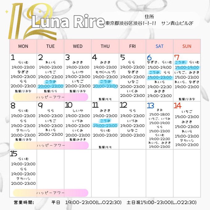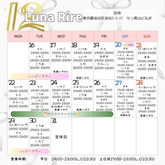 渋谷・中目黒・五反田 Luna Amour黒宮しいか☁️【LOVEME】@_shiikadayo·4時間*⋆ Luna schedule ⋆* ⋆┈┈┈┈┈┈┈┈┈┈┈┈┈┈⋆ 10日19:00~23:00🥂➡️Luna Etoile衣装 13日19:00~23:00🥂(来店予約あれば15:00以降何時でも可能) 18日19:00~23:00🥂 22日19:00~23:00🥂➡️クリスマスイベント🎄 ⋆┈┈┈┈┈┈┈┈┈┈┈┈┈┈⋆ しぃスケ詳細⬇️ 🗓http://timetr.ee/p/shiikadayo引用Luna Rire(Luna Amour Group)@_lunarire_·12月9日\12月キャストスケジュール🌙/ 🍺月火水(祝日を除く)ハッピーアワー 🎂お誕生日の方特典あり 🗓️https://timetreeapp.com/public_calendars/lunaamour… ⭐️公式LINE⭐️※来店予約可 https://line.me/R/ti/p/@684nasvj?oat_content=url&ts=06242123#…~ 🩷遠隔応援🩷 https://lunaamour.base.shop35267