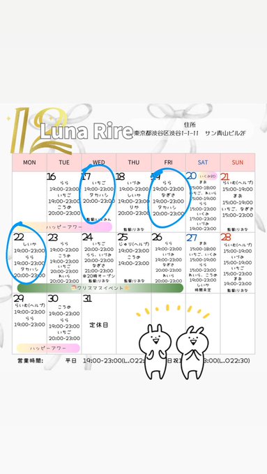 渋谷・中目黒・五反田 Luna Amour固定兎姫こうめ🐰👑@5mechima·🐰12月お給仕スケジュール🐰 リル≫🌙 シュシュ≫🎀 11日🌙19:00~23:00 16日🌙20:00~23:00 19日🎀19:00~23:00 20日🎀15:00~23:00 22日🎀19:00~23:00 23日🌙🎄19:00~23:00 25日🌙🎄19:00~23:00 27日🌙19:00~23:00 30日🌙19:00~23:00 31日🎀 遠隔応援💭http://lunaamour.base.shop1414567