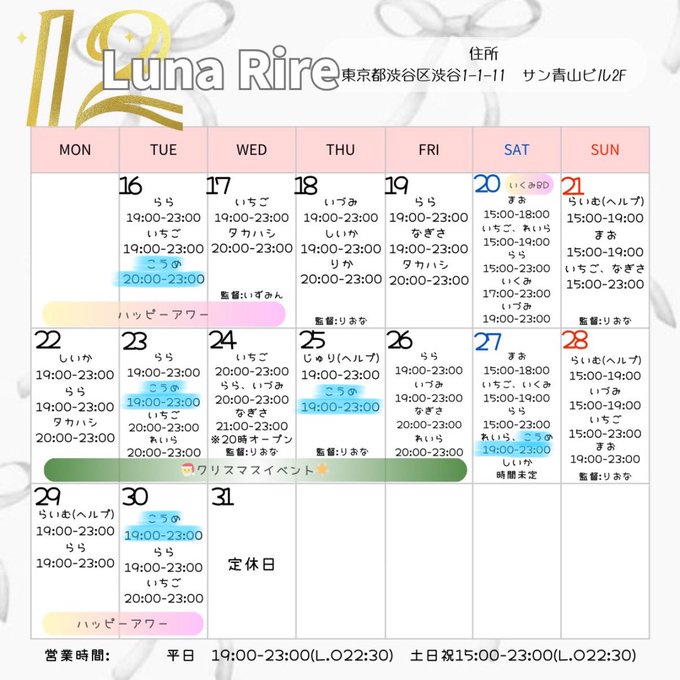 渋谷・中目黒・五反田 Luna Amour固定石田もか@1/10(土)バースデーイベント🎂@moka_15_moka·12月後半シフトです! 今回はミスってないはず!117114