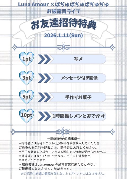 渋谷・中目黒・五反田 Luna Amourあやせらら🌙Luna Amour@ayase_rara·8時間1/11お披露目ライブの招待特典が発表になりました✨ららの手作りお菓子ぜひたべてほしいな〜🥰🫶💓 ライポケでも店舗でもチケット販売中なのでぜひゲットしてね´∩。•ω