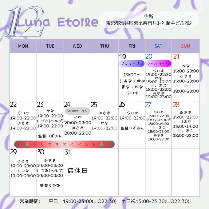 渋谷・中目黒・五反田 Luna Amour今村美咲 ୨୧⑅*LunaAmourさんがリポストLuna Etoile(Luna Amour Group)@オープニングキャスト大募集@_lunaetoile_·\12月キャストスケジュール🌙/ 🍺月火水(祝日を除く)ハッピーアワー 🎂お誕生日の方特典あり 🗓https://timetr.ee/p/lunaetoile ⭐️公式LINE⭐️※来店予約可 https://line.me/R/ti/p/@684nasvj?oat_content=url&ts=06242123#…~ 12/19🪽プレオープン https://t.livepocket.jp/e/etoile1219 12/20🪽グランドオープン ご来店お待ちしてます💜510424