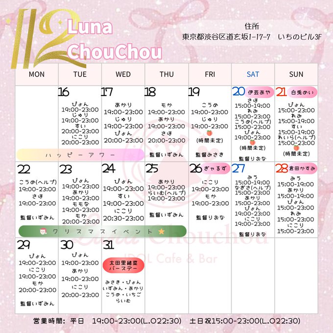 渋谷・中目黒・五反田 Luna Amour南いくみ12/20BDイベント🎂🎀さんがリポストLuna Rire(Luna Amour Group)@_lunarire_·\12月キャストスケジュール🌙/ 🍺月火水(祝日を除く)ハッピーアワー 🎂お誕生日の方特典あり 🗓️https://timetreeapp.com/public_calendars/lunaamour… ⭐️公式LINE⭐️※来店予約可 https://line.me/R/ti/p/@684nasvj?oat_content=url&ts=06242123#…~ 🩷遠隔応援🩷 https://lunaamour.base.shop47320