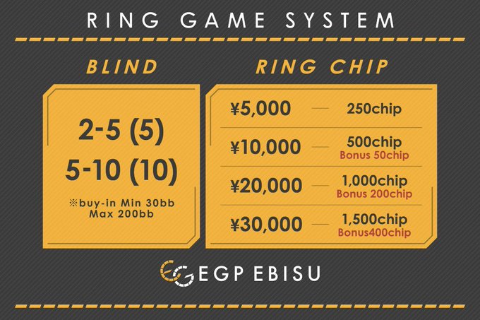 POKER BAR『EGP EBISU』@EGP_EBISU·⚜️新規リング応援キャンペーン⚜️ ご来店初めましての方限定で リングゲームご参加の方に リングチップ50BB(5,000円相当)プレゼント🎁🎁 ⬇️参加方法⬇️ 1、EGP EBISUに初めて来店する 2、公式LINEを追加する 3、リングチップを購入する 当店では初心者講習を毎日無料で実施中‼️さらに表示2234
