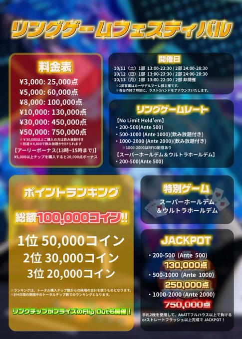 KKLIVE POKER SHIBUYA@KKLIVESHIBUYA·✨リングフェス開催✨ 10/11~10/13は特別リングday‼️ スーパーホールデムや ウルトラホールデムが遊べるテーブルや、 リングチップが貰えるフリップアウトなど 普段とは一味違う楽しみが盛り沢山😊 ハイレートテーブルでは RFID配信で大盛り上がり⁉️ さらに‼️ 各レート毎にJACKPOTがあり、さらに表示620