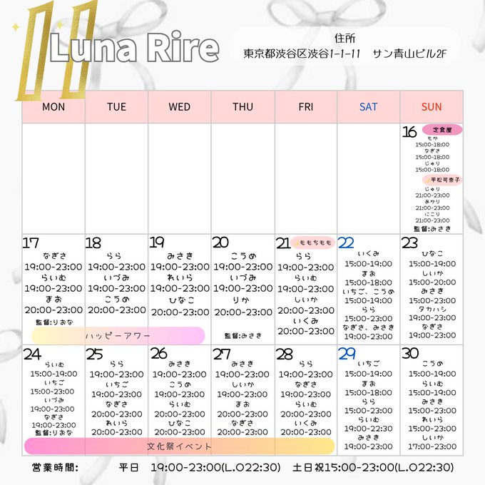 渋谷・中目黒・五反田 Luna Amourあやせらら🌙Luna Amour@ayase_rara·12時間本日は文化祭イベント最終日🔥 シュシュのトップ衣装着て◯◯ヘアします✌️ 激レアなのと20歳の気持ちでがんばるので会いにきてくれると嬉しいです(⸝⸝ᐡ. ̫ .ᐡ⸝⸝)💦 チェキ+ショットバトル絶対勝って3号店の衣装きたい!ご来店も遠隔も待ってます🎀💓引用Luna Rire(Luna Amour Group)@_lunarire_·11月8日\11月キャストスケジュール🌙/ 🍺月火水(祝日を除く)ハッピーアワー 🎂お誕生日の方特典あり 🗓️https://timetreeapp.com/public_calendars/lunaamour… ⭐️公式LINE⭐️※来店予約可 https://line.me/R/ti/p/@684nasvj?oat_content=url&ts=06242123#…~ 🩷遠隔応援🩷 https://lunaamour.base.shop3313341