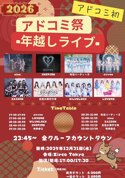 渋谷・中目黒・五反田 Luna Amour黒宮しいか☁️【LOVEME】@_shiikadayo·3時間人生初の年越しライブ🥰🥰🥰 年越し一緒に過ごしたいよね‼️‼️‼️‼️‼️ 2025年最後も2026年最初も一緒に過ごせるなんて家族じゃん🎶ྀི 家族になろうよ〜♪笑引用LOVEME@LOVEME_idol·11月23日💖情報解禁💖 12/31 (水) 『アドコミ祭 -年越しライブ-』 ▪︎会場:新宿Zirco ▪︎チケット(別途1D) 前方チケット ¥4,000- 一般チケット ¥2,000- ▪︎ライブ🎤17:55-18:20 ▪︎特典会📸19:15-20:20 ▪︎指名特典(前方チケットのみ):写メ券(メンバー選択可) チケット11/24(月) 22:00~さらに表示216250