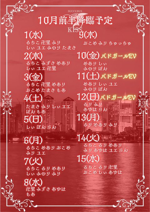 サキュバスシーシャKISS💋赤坂店@succubus_akasak·赤坂サキュバスシーシャ💋 OPENしました✨ 💟17:00-26:00 💟本日ショットday🍸 💟ご新規様🈹アリ◎ 10/3(金)のサキュバス😈💗 17:00~ 卍里@bnr_SK_ もあ@moa_aeruya3 19:00~ たまき@tama__sk 19:30~ おこめ@okome_succubus 20:00~ めあり@meachi_sk るちこ@ruchiko_1185