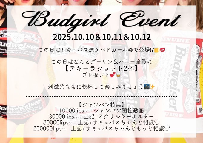 固定サキュバスシーシャKISS💋赤坂店@succubus_akasak·❖━━━━━━━━━━━❖ 10月前半降臨予定 ❖━━━━━━━━━━━❖ 10.11.12🥃バドガールEV この日はショット2杯サービス💕😈 💋毎週金曜日はショットday 💋新規様1H飲み放題3000Lips,Taxなし 【営業時間】17:00~26:00.日曜23:00close12327