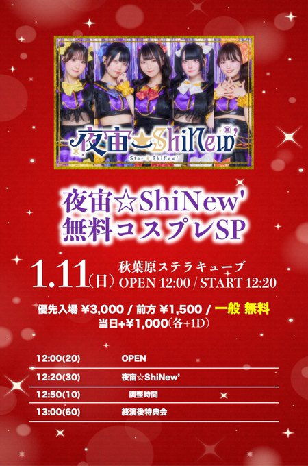 渋谷・中目黒・五反田 Luna Amour姫翠桃菜💍夜宙☆ShiNew'さんがリポスト夜宙☆ShiNew'@star_shinew·15時間✨回し特典追加✨ 有料チケットで2回し→全員写メ券 有料チケットで3回し→集合写メ券引用夜宙☆ShiNew'@star_shinew·1月10日🔮1/11(日)夜宙☆ShiNew'スケジュール🔮 ①📍秋葉原ステラキューブ 🎤12:20(30) 📸13:00(60) 🎟️http://t-dv.com/ShiNewCosplaySP0111… ② 📍としま区民センター 8F 多目的ホール 🎤17:05(20) 📸17:35(60) 🎟http://t-dv.com/soda0111 ③📍秋葉原ステラキューブ 🎤20:45(25) 📸21:20(60) 🎟️http://t-dv.com/CafeRevo2manCosplaySP0111…271,804