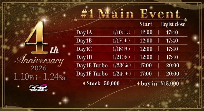 渋谷・中目黒・五反田 GoodGamePokerLive渋谷【渋谷GGPL】GoodGame Poker Live SHIBUYA@GGLIVETOKYO·🎉【GGSB4周年記念イベント】🎉 明日1/17(土)12:00 【#1 Main Event Day1B 15K】 Stack:50,000 Reg-Close End:17:40 https://pokerguild.jp/tournament?ik=3499… Day2開催日は1/25(日)11:00~ #1 Main EventのDay1スケジュールはこちら⬇️画像を編集11790