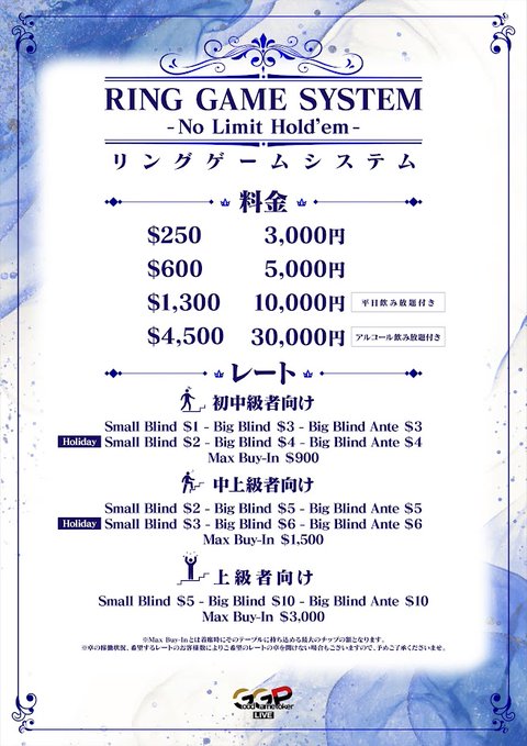 渋谷・中目黒・五反田 GoodGamePokerLive渋谷【渋谷GGPL】GoodGame Poker Live SHIBUYA@GGLIVETOKYO·【DAILY PERKS】 \#GGPL 《リングゲーム》平日限定サービス🎉/ ✅12~15時限定⏰ ┏━━━━━━━━━━━━━━━━━━┓ 5,000円分以上ご購入で➕$2️⃣0️⃣0️⃣💝 ┗━━━━━━━━━━━━━━━━━━┛ ✅平日何時でも⭕ 🌟10,000円分ご購入で《飲み放題》🥂🌃 料金表はこちら⤵️477