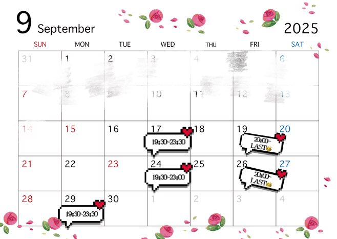アイドルカフェ&バー♡乙女ハウス@otomehouse·9月30日(火) 🎀🏠 営業時間19時- みに 19-L しずく 20-22 ねむり 21-L さくら 22-L ご帰宅お待ちしてますʚ🎀ɞ2138