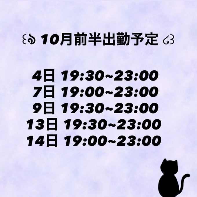 りず🐈⬛🥀@rizu_myaa·10月前半出勤予定です🪼 ちょいちょい時間違うけど今回割とがんばる(当社比)ので応援しに会いに来てください(̳ˆ_ ̫ _ˆ ̳)໒꒱1284