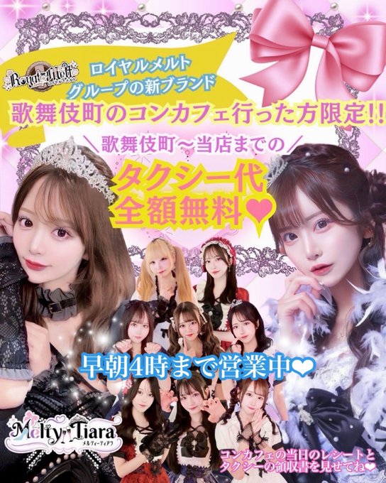みぃな©️👑♡♡@UsaUsamiina·7月22日コンカファーたちに朗報。早よ来てください引用メルティーティアラ(Melty Tiara) / 新宿コンセプトカフェ/コンカフェ@Melty_Tiara·7月22日本日よりオープニング特大2大キャンペーンを実施します✨ 使用方法は「当店のSNSをフォロー&投稿を見たと伝える」のみです♥️ キャンペーン②は、なんと、 歌舞伎町のコンカフェに行ってた方、当店へのタクシー代が「全額無料」キャンペーンです🚖 当店は朝4時まで営業中です♥️ #新宿コンカフェ6314