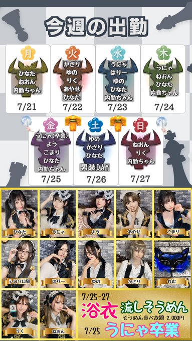 ひなた♂ボドゲコンカフェ店長さんがリポストボドゲコンカフェ【BRETTBURG】@Brettburgsinjuk·【今週の出勤】7/21〜7/27 ご確認ください。 【イベント】 7/23(水)〜25(金) うにゃ卒業 7/25(金)〜27(日) 浴衣流しそうめん 遠隔で応援してくれる方はこちら http://brettburg.base.shop キャスト紹介&アカウントはこちらから📍 http://brettburg-shinjyuku.com/cast/ 新人キャストもまだまだ募集中です🎀さらに表示31306