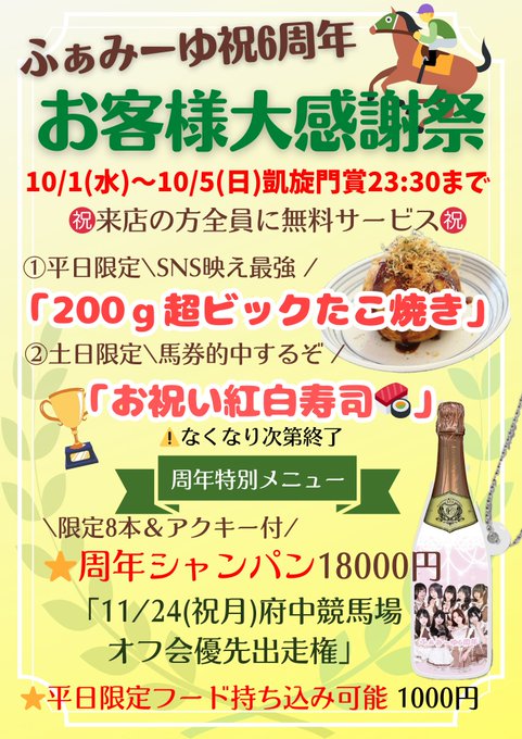 競馬cafe&barふぁみーゆ🐎新宿駅東口から徒歩5分@famille_keiba·🌟10月4日(土)🌟 🎊㊗️6周年🥳 ✨👏お客様大感謝祭👏✨ 👑ご来店の方全員無料👑 「お祝い紅白寿司❤️」 ⚠️なくなり次第終了 #JRA #船橋競馬 #園田競馬 #名古屋競馬 5台の大画面で予想観戦しよう❣️ あきほ なみ アイ あいら しずく うらら ご来店お待ちしております♥️310278