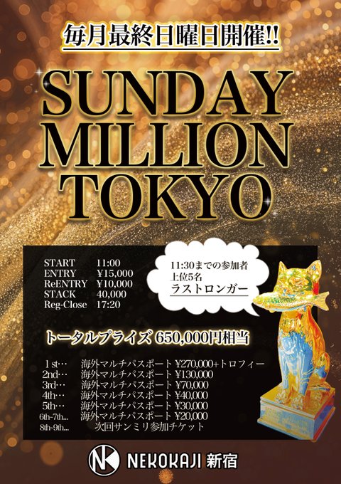 ネコカジ新宿本店(NEKOKAJI新宿)@neko_kaji·🐠7月27日🐚\\日曜日// 11:00〜 ⚜️Sunday Million Tokyo⚜️ を開催します🌟 "17:20"までどなたでもご参加できます❣️ 🐾スタック 40,000点 🐾参加費 15,000円 🐾リエントリー 10,000円 🎟️サンミリチケットをお持ちの方は+3000円でご参加可能✨さらに表示1286