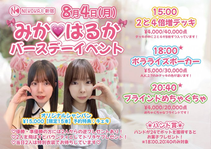 ネコカジ新宿本店(NEKOKAJI新宿)さんがリポストはるか@NEKOKAJI新宿@Nekokaji_haruka·7時間告知出してもらってた❕8/4BDです❕ 出勤してなさすぎてみんな私のこと忘れてないかな〜と不安ですが(;;) みかさんのついでにでもお祝いしてくれたら嬉しいです🫶 友達がほしいって言ってくれたから私のオリシャンも作ってもらっちゃった、合格前祝い(?)にぜひ…🥲引用ネコカジ新宿本店(NEKOKAJI新宿)@neko_kaji·8時間8/4(月) 🎀👼みか💗はるかバースデーイベント👼🎀 開催します🥂🎂✨ みかちゃん&はるかちゃんのお誕生日を みんなでお祝いしましょう🥳🍰 15:00~ 🧑🧑🧒🧒2と4倍増デッキ🧑🧑🧒🧒 18:00~ 👼ポラライズポーカー👿 20:40~ 🌀ブランドめちゃくちゃ🌀 🪽ハンド賞🪽さらに表示211590