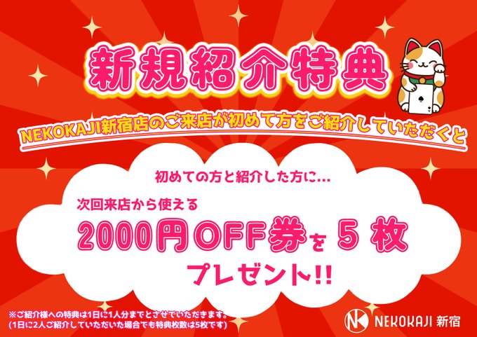 ネコカジ新宿本店(NEKOKAJI新宿)@neko_kaji·🌷🤝新規紹介特典🤝🌷 NEKOKAJI新宿店のご来店が初めての方を ご紹介していただくと‼️ 🐱初めての方と紹介した方に🙌 次回から使える 2000円OFFクーポンを5枚 プレゼントします🎁✨ 🔰初心者大歓迎🔰 初心者講習あります🐥 ポーカーのルールが分からない方も 安心して遊べます❣️1262