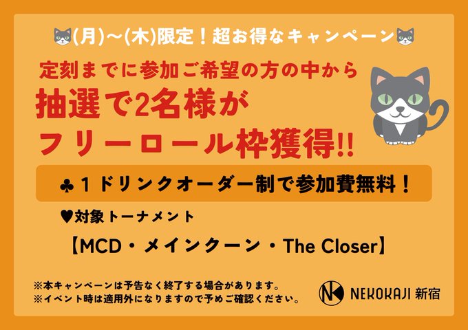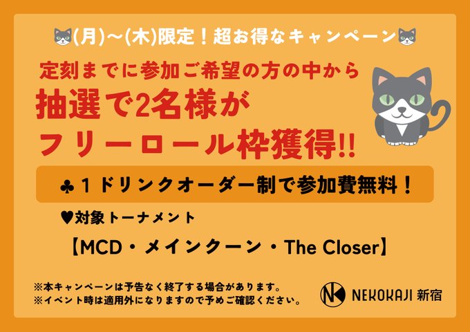 ネコカジ新宿本店(NEKOKAJI新宿)@neko_kaji·(月)〜(木)限定‼️ 超お得なキャンペーン‼️ 🆓🆓 🆓🆓 🆓🆓 抽選2名様 フリーロール✨ 🆓🆓 🆓🆓 🆓🆓 🥤1ドリンクオーダーで参加費無料😃❣️ ➿➿➿➿➿➿➿➿➿➿➿➿➿ 対象 (月)〜(木)の 【MCD、メインクーン、 The Closer】 定刻までに参加希望された方の中から抽選さらに表示1182