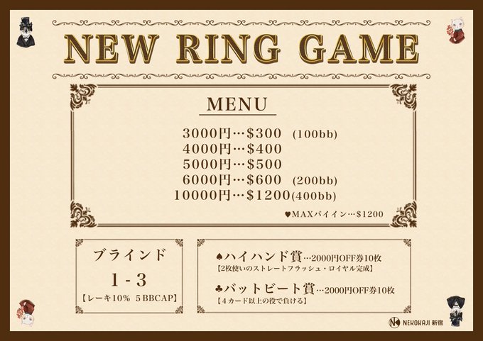ネコカジ新宿本店(NEKOKAJI新宿)@neko_kaji·🌈仮想CashGame☁🌈 15:00〜🐈⬛💕 🎪今月のミニゲーム🎪 🎡ルーレットチャレンジ🎡 お得なチケットを手に入れよう👊✨ 🔰初心者講習🔰 ポーカー初心者の方でも安心して楽しめます🥰 💎詳細・月間ランキング💎 http://x.gd/qSAXB ☎️お問合せ 03-6228-0366204